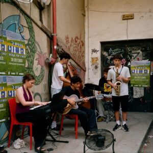 חמישה נגני ג’אז צעירים (15-18), מגיעים לנגן בחצרות המתועשות במתחם המרץ2.